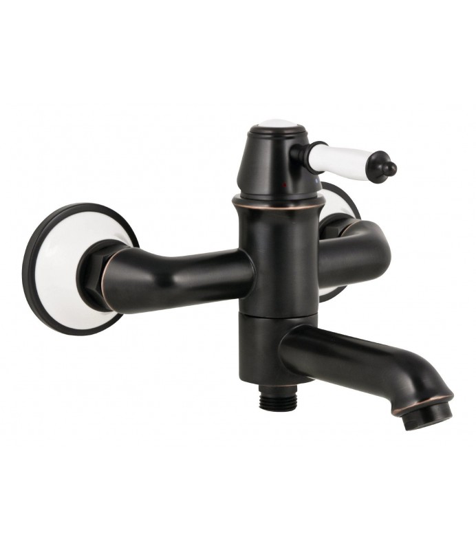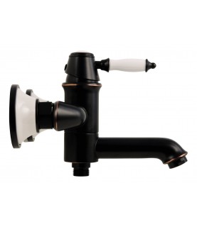 Bateria wannowa Sanitop Rina to oryginalna bateria wannowa, która zachwyca formą i kolorystyką. Bateria wannowa wykonana została w modnym kolorze czarny mat. Na krawędziach bateria posiada efektowne miedziane przetarcia. Ciekawym, designerskim rozwiązaniem są ceramiczny uchwyt oraz rozetki w kolorze białym. Bateria wannowa wyposażona została w ceramiczną głowicę, która zapewnia płyną regulację przepływu wody. Bateria nie posiada słuchawki prysznicowej oraz węża (do kupienia osobno). Bateria wannowa wyróżnia się nie tylko wysoką jakością wykonania, ale również świetną formą, modnym, czarnym kolorem oraz atrakcyjną ceną.